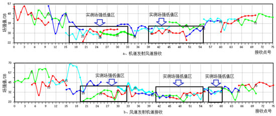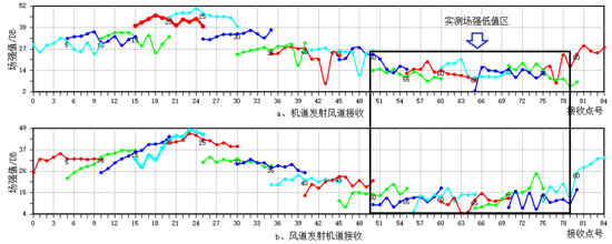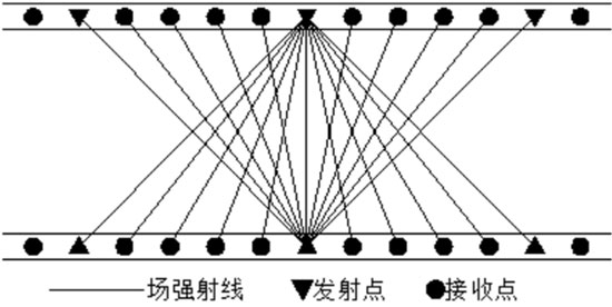 无线电波透视勘探过程中,风道及机道均对应布置测线长度840m,接收点85个,接收点间距10m,发射点16个,发射点间距50m,且发射点均在测线开始的50m位置开始布置,每条巷道1个发射点对应另一条巷道11个接收点。
