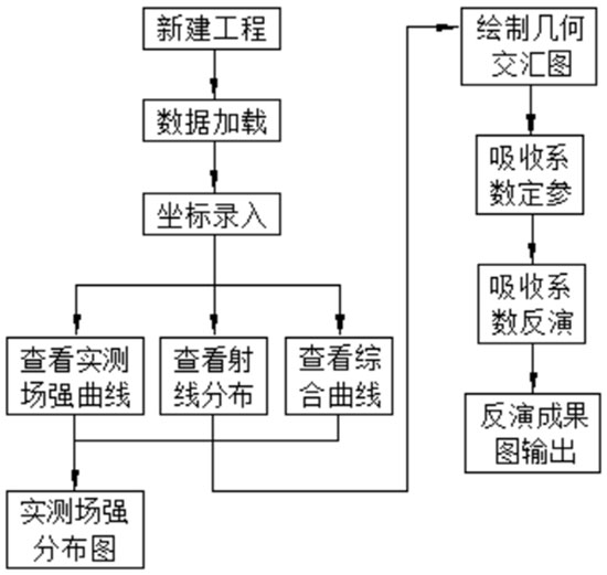 无线电波透勘探数据解释方法主要有场强对比法与成析层像法[7]两种,数据处理主体流程见图4,通过数据处理一般得到射线分布图、综合曲线图、异常交汇平面图、实测场强曲线图、实测场强分布图、吸收系数成像[8]图等。