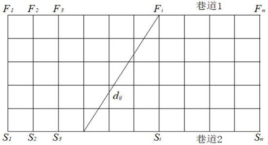 成析层像法[9]的应用主要体现在实测场强分布成像及吸收系数反演成像中,对于基于成析层像法的吸收系数反演成像,公式(1)体现了煤层介质中任意一点磁场,然后把进行无线电波透视的回采工作面划分为若干具有不同吸收系数的小单元[10],即像元,每一个像元内部介质视为均匀的。网格划分示意图见图5。