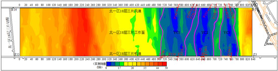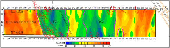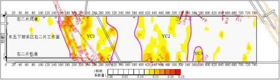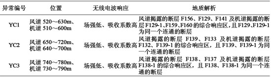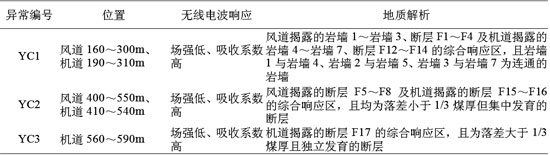 通过对勘探数据进行处理分析得到最终成果,图9为实测场强曲线图,分析知风道160~330m、机道190~330m范围,风道390~550m、机道410~550m范围,机道560~600m范围,三处为低值异常区,图10为实测场强分布与地质成果图,图11为吸收系数成像与地质成果图,结合两种分析成果得到3处明显异常区,且都集中在实测场强曲线确定的异常范围内,分别命名为YC1、YC2、YC3,结合地质资料及实际揭露情况,得到最终应用结论,详见表2:勘探成果异常解析表。