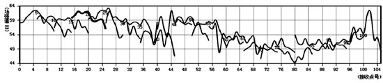 本次所采集数据实测场强值(见图1)总体上在50~60dB,最小值在40~50dB。从井下实测场强值来看,背景测试值很低,在5dB左右,与最高场强值相比,有很大的变化范围,说明数据信噪比高。由于井下运输巷积水严重,且风巷一直有矿车在运行干扰,对数据可靠性有一定影响。(图1中的网格表内数字为发射点号,网格表内的曲线代表接收范围内dB值的变化幅度;纵坐标为场强值,单位dB;横坐标为接收点号)