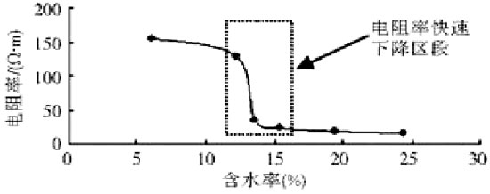 电阻率是表征物质导电性的基本参数之一[15],是由温度、压力、孔隙度、孔隙结构、饱和度等因素[16]综合决定。土质坝体电阻率的分布主要受控于土质含水率的大小,正确认识电阻率与含水率之间的关系,对坝体并行电法测试应用具有重要物性意义。本次试验仪器选用WBD并行电法仪.测试土体是利用取土器取自于多种类型土石坝,测试采用小四极法中的温纳四极排列方式进行不同含水率黏士体的电阻率测试。限于篇幅,选用某均质土坝中黏土的电阻率与含水率之间的关系(见图1)作简要说明。从图1中曲线图上可以直观看出,黏土的电阻率整体是随着其含水率增加而呈现逐渐减小的趋势但不同含水率范围内电阻率的变化规律是不尽相同的;在含水率8%~17%之间.电阻率下降的尤为剧烈。