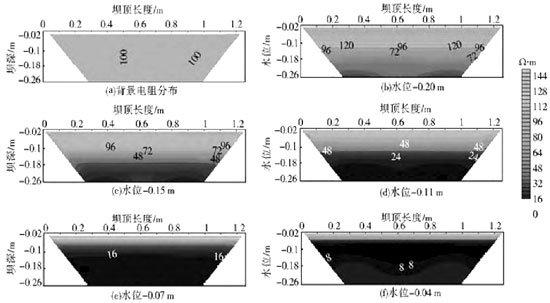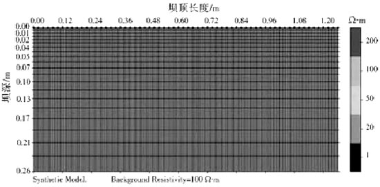 本次数值模拟足在EarthImager2D软件的正反演模拟平台上进行。模型是山坝项长度1.26m,坝深为0.26m的堤坝纵剖面断面构成。坝体土体电阻牢设置为100Ω•m,水的电阻率设为1Ω•m(见图2)。坝体中水位分别设置为-0.23m,-0.20m,-0.15m,-0.11m,-0.07m,-0.04m,-0.02m等几个位置。在坝顶而批布置64道电极,电极间距0.02m。采用垂向上分辨率较高的温纳四极[17]装置作为测带方式,得到一组坝体电阻率变化的剖面(图3)。