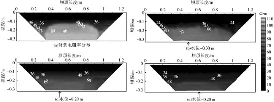 2.2 物理模拟实验及分析物理模型在室内的有机玻璃水槽中进行,水槽的具体参数如下:整体高度0.6m,长度为1.3m,宽0.8m,坝体两端采用垂直面。实验选用含水率为12%的黏土作为筑坝材料,填筑过程中采用分层辗压方法,保持土体的均一性。坝体模型长度为1.3m,高度0.5m.梯形坝顶和坝底上下层面分别为0.4m,0.6m,图5为坝体的模型图。电极采用直径0.5mm,长度2cm的铜棒自制而成,电极间距为2cm,共布置64道电极。实验过程中,每注水5cm静止2h后,测量1次,共得到11组电法数据。限于篇幅,本文选用了4组并行电法采集的数据进行对比分析,说明实验效果,见图6。