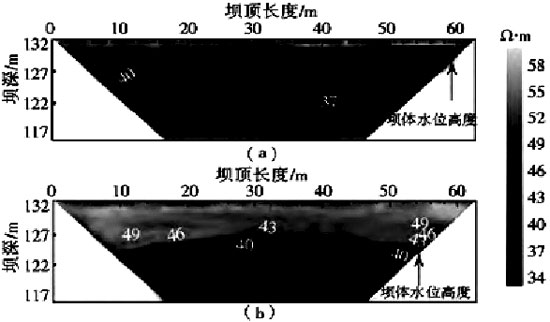 从反演电阻率剖面图上可以看出.整体电阻率值与水位的抬升具有紧密的联系。不同高程的水位反演图对比分析,得到了以下认识:坝体内部电阻率随水位的上升而下降,可以根据电阻率的变化情况反映出坝体内部水位动态变化;但对于坝体水位较深的部位,电阻率的变化明显性降低,分辨能力有限。