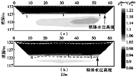 (3)由于坝体电阻率是多种因素综合作用的结果,且水位附近电阻率值表现出渐变性,但在含水层面表现突变的特点,利用垂向相邻测点电阻率比值参数的大小进行水位的标定。此项处理手段增大了电阻率区分水位的分辨力。