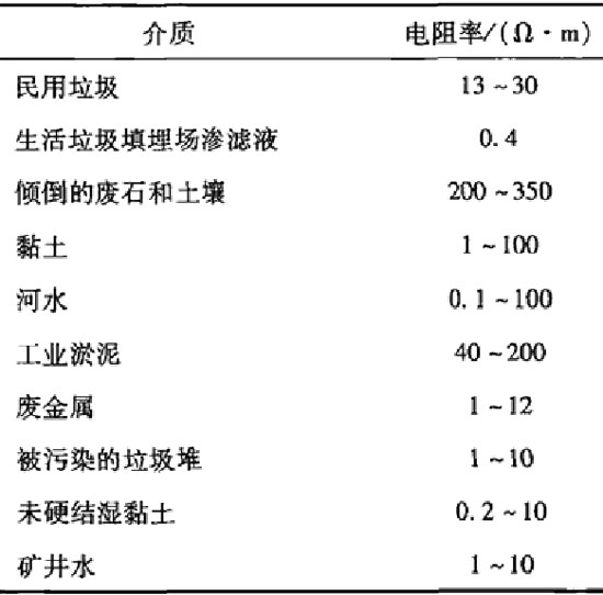 电法勘探是以岩土体电学性质的差异为基础,通过查找异常体的位置、形态、埋深及规模来定位空间参数。服务于工程地质勘察、水文地质调查、矿产资源开发和环境污染治理等领域。城市生活垃圾填埋场巾的渗滤液,主要成分为以阴、阳离子形式存在的无机物质,电化学性质比较活泼,易于土壤发生复杂的系列反应,进而改变了原土壤介质的电学性质。由此,打破了原有土壤在垂向和横向上电性的稳定性、规律性与渐变性,与周围原土体的电学性质差异明显,具体表现为电阻率值相对较低。另外,渗滤液中含量相对较少的有机物,电学性质较多变。其中难溶于水的表现出成层现象,互溶且具有活性的有机物质也可引起土壤电学性质发生改变。表1列举了几种常见的介质电阻率值,可见受污染后的介质与正常介质电性差异显著,这是进行电法测试的前提条件和物质基础。