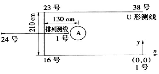 面上扩散特征的研究采用类似电法超前探系统[14]布置方式,即各电极呈线性排列,可疑异常体位于测线正前方。实验采用自制的铜电极,横截面积为0.5㎡,共布置38个电极,电极埋深0.5cm左有。测线上共布置24个电极,其1号电极距洞体水平距离为20cm,电极间距为10cm。垂向扩散特征的研究采用并行二维电法技术[15],观测电阻率在立体反演图垂向变化的情况。观测系统一般是围绕可疑异常体周围布置电极,利用并行电法系统展开工作。测试系统采用半包围“U”形式布置,即1号作为起点(0,0),38号电极为尾点(0,2.1),16号(-4.5,0),23号(-4.5,2.1)号分别为“U”形的端点,电极间距为30cm。A洞体距16~23号电极测线的垂直距离为130cm(见图1)。