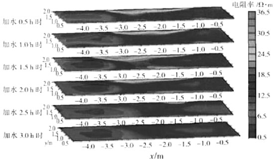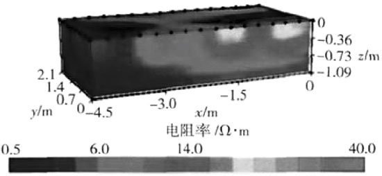 土壤被NaCl溶液浸染后,其电阻率较背景值有所降低,表现为低阻异常,与周围介质存在明显的界限。图3为注NaCI溶液2.5h后的电阻率立体反演图,可明显看出图中x=-3.0~-4.5m、y=0~-2.1m、z=0~-0.7m区域电阻率值在0.5~4Ω•m变化,且有明显分界。电阻范围和洞体基本吻合,说明并行电法技术可测试和判定渗漏液浸入区准确位置。