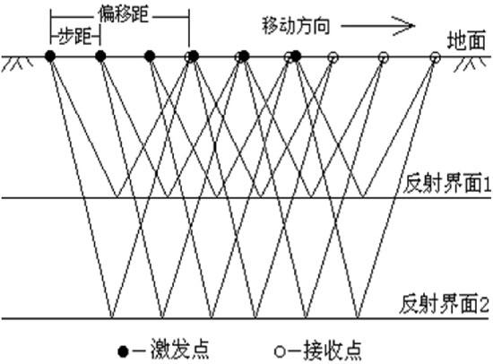 现场探测时是在最佳窗口内选择一个公共偏移距,采用单道小步长,保持炮点和接收点距离不变,同步移动震源和接收传感器。每激发一次接收一道波形,最后得到一张多道记录,各道具有相同的偏移距。上图为共偏移法现场施工示意图。另一种方法是通过对共炮点记录进行自动排列,也可以获得各种偏移距的共偏移剖面。利用这种共偏移地震剖面,可正确识别反射波同相轴,由于偏移距相同,数据处理时不需作正常时差校正。工程中常用来对反射波同相轴位置及特征进行了解,由于这种方法施工较为简单,特别适用于矿井煤岩巷道或工作面构造及异常地质体的调查工作。