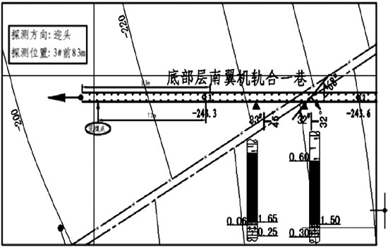 后经过巷道掘进过程中验证在巷道探测位置(3#点83m)前方17m见36煤层,煤厚1.8m,与探测结果相符;前方33m位置见粗砂岩与中砂岩分界面;52m见断层,断层落差7m,倾角57°。详见下图: