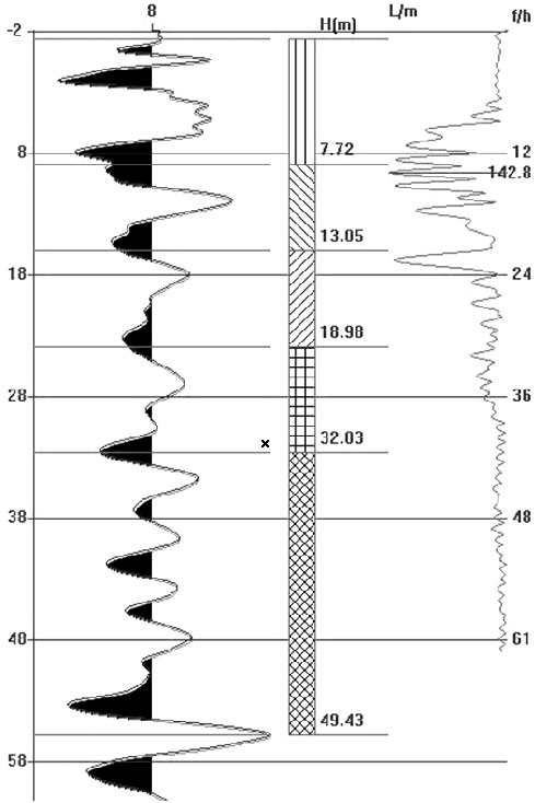 目前地震单点探测数据的处理与解释方法为直接分析法与单点分析法,其中直接分析法通常用正弦或余弦图示方法来描述沿观测巷道探测区域内频率、速度、振幅的变化规律,频率越大、波速度越快位置,表示岩性越坚硬,反之频率越小、波速度约慢的位置,表示岩性越坚软,通常情况利用此波形频率、速度进行判断岩性软硬,作为找煤、岩层、断层、火成岩、陷落柱依据;振幅越大,反射能量越强,寻找岩性改变界面。