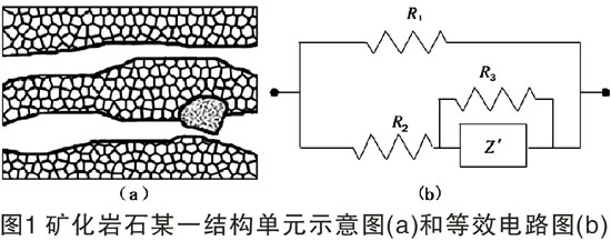 式中,τ为时间常数;c为频率相关系数;如果将矿化岩石的一个基本结构单元简化成图1a所示结构,则可用图1b所示的等效电路来模拟表示。