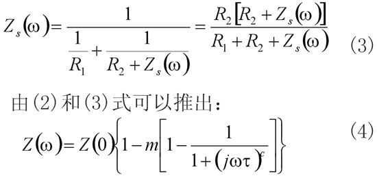 式中,I(ω)为供电强度;ΔU(ω)是输出复电位值;R(ω)是与频率相关的传递函数,表示复阻抗。在频率域电子导体与电解液界面上的复超电压可等效看作是单位面积上的复阻抗,于是构建一条等效电路便可模拟出电子导体与电解液界面上的阻抗,阻抗Zs(ω)表达式为: