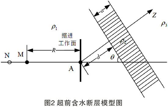 随着我国煤矿开采不断趋向深部,围绕煤层工作面开展的生产准备坑道在掘进过程中,常遭遇断层、陷落柱及岩溶等含导水地质构造,给煤矿生产安全造成了严重的水害威胁[1-3]。目前,矿井直流电阻率法[4]、矿井瞬变电磁法[5]、矿井地质雷达[6]及矿井地震波探测方法[7]是超前预测预报上述含导水地质构造的主要技术手段,但经过大量实践,一些应用技术问题表现突出,如矿井直流电阻率法在数据采集时受现场地电干扰大[8],且电场随布极距离的增大而快速衰减;矿井瞬变电磁法受掘进工作面周边金属类支护体的干扰严重[9];矿井地质雷达探测距离短且受金属干扰;矿井地震波对含水体的响灵敏度不够且现场探测施工程序繁琐等。以上问题导致这些方法在实际应用中存在数据采集质量低以及难以满足快速掘进生产等需求。为此,本文在矿井直流电阻率法的基础上,充分考虑其优缺点,提出矿井坑道音频电超前探测方法,拟通过建立坑道掘进前方含水断层的理论地电模型,分析视频散率的分布特征,并通过现场实践进一步检验该方法的可靠性。音频电超前探测方法的理论基础[10]。