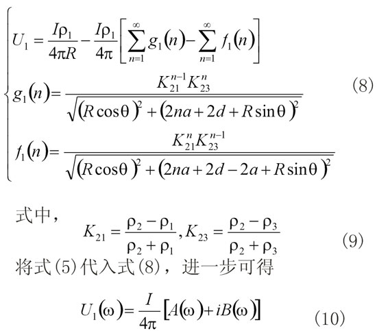 如图2假设含水断层均匀且沿走向无限延伸,断层厚度为a,断层倾角为θ,电阻率值为ρ2,极化率为η2,到供电点源A的垂直距离为d,断层靠点电源一侧岩层电阻率为ρ1,极化率为η1,断层远离点电源一侧岩层电阻率为ρ3,极化率为η3。