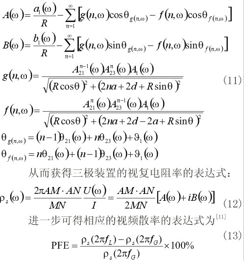 式(4)即为Cole-Cole阻抗表达式。因此,依据式(4),可得由岩石的激电效应引起的复电阻率的频谱表达式为: