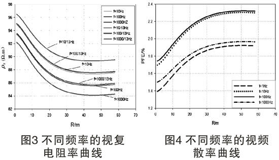 图3是不同供电频率条件下对应三极装置的视复电阻率分布曲线。从中明显可见,随供电点A与测量电极MN的距离R增大,视复电阻率值逐渐下降,为坑道掘进前方拟设含水断层所引起;但供电频率不同时,视复电阻率曲线差异很大,总体表现出随供电频率升高,视复电阻率值减小,但曲线形态差异较小。图4是不同供电频率条件下对应三极装置的视频散率分布曲线。可见,随探测距离R增大,视频散率值逐渐递增,同样为含水断层所引起。但频率与视频散率之间的关系并非像与视复电阻率那样的单调关系,而是在频率为100Hz附近时达到最大的视频散率,当频率过低(如f=1Hz)或频率过高(如f=1000Hz),视频散率值均较小,说明利用音频电法超前探测时,应选择高频为100Hz或其附近的频段,可获得较高的视频散率曲线。