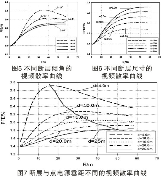 算相应的PFE数据。从图5可见,断层倾角的变换将引起视频散率值的大幅变化,如θ=10°和θ=90°对应的曲线极大值之间相差约0.3%;同时曲线的形态也出现明显的改变,在断层倾角较小时,曲线呈单峰形态,而当断层倾角较大时,曲线呈递增分布。图6为改变断层尺寸情况下的视频散率曲线,从中明显可见,随断层尺寸增大,视频散率值大幅上升,受含水断层的影响越大,电性异常越明显。图7给出了改变断层与供电点距离情况下视频散率的分布曲线。从中可见,垂距d的改变,将引起视频散率的幅值和分布形态的显著变化,d从小逐渐变大时,视频散率极大值逐渐减小,其对应的距离R逐渐增大,视频散率曲线从单峰逐渐变化为单调递增,反映含水断层随视频散率的影响逐渐增大,即电性异常变得更为显著。从以上分析可见,就理论而言,对于实际中不同断距、不同产状且与坑道掘进工作面不同距离的含水断层,采用音频电法进行超前探测时,其视频散率均表现出较为显著的电性异常,但异常特征会随上述参数的改变而表现不同。