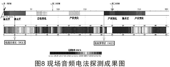 为确保该坑道顺利安全掘进,巷道掘进过程中必须查明裂隙、断层等可能富水发育构造,防止巷道与水体导通。现场进行了音频电法超前探测试验。利用采集的128Hz和16Hz的视复电阻率数据计算视频散率,并按照文献[11]的方法进行视频散率偏移成像,获得音频电法的测试结果,如图8所示,在3次超前探测试验中共揭露了2个高频散区(即低阻异常区),推断该段岩层裂隙发育且含水。经现场掘进揭露,2个高频散区均为岩层含水所致,在频散率变化区,或为岩性变化,或为岩层产状变化,局部为断层影响区。综合探采结果对比验证,可以确定本次音频电法超前探测结果是较可靠的,也进一步验证了该方法的有效性。