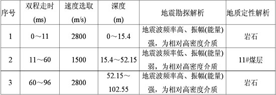 从多道地震剖面图及色谱剖面图可看出,共分为三段,0~11ms、60~96ms频率高、振幅(能量)强、11~60ms频率低、振幅(能量)弱。通过对岩石、煤层速度总结与选取,结合h=vt/2,从而计算出距离,得知:102.55m范围内,15.4m附近揭露11#煤层,且穿煤厚度36.75m左右,见表1。