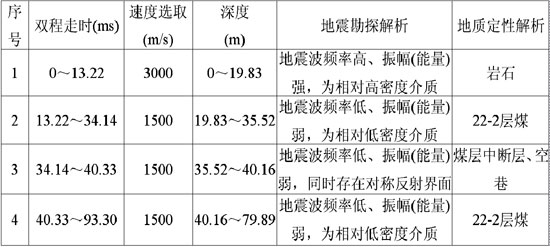 共分为四段,0~13.22ms频率高、振幅(能量)强,13.22~34.14ms、34.14~40.33ms、40.33∽93.30频率低、振幅(能量)弱,其中34.14~40.33ms存在反射相位异常。通过对岩石、煤层速度总结与选取,结合h=vt/2,从而计算出距离,得知:79.89m范围内,19.83m附近揭露22-2层煤,35.52~40.16m煤层中断层、空巷,详细见表2。