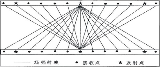 图1 常用无线电波坑道透视定点法发射与接收范围示意图