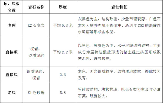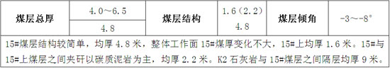 15#煤层结构较简单,均厚4.8米,整体工作面15#煤厚变化不大,15#上均厚1.6米。15#与15#上煤层之间夹矸以碳质泥岩为主,均厚2.2米。K2石灰岩与15#煤层之间隔层均厚9米。