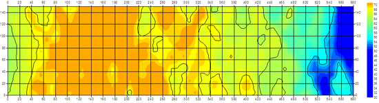 1:回风顺槽测线30至70m范围,运输顺槽00至30m范围,场强值介于63-68dB之间,综合分析范围内煤层较稳定,地质构造不发育。