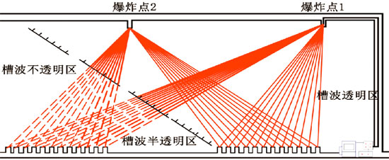 它是槽波地震法中最基本、最常用、最可靠、最重要的方法,槽波透射法所用的有效波是从震源透过煤层传至接收点的直达槽波信号。如图2-1所示,炮点与检波点(接收点)布置在采区周围不同巷道内,根据槽波的有无、强弱来判断在相应的透射射线扇形区内有无构造异常。同时,还可以通过对正常透射槽波的分析,为反射法数据的处理及解释提供参数等,探测范围可达煤厚的几百倍。