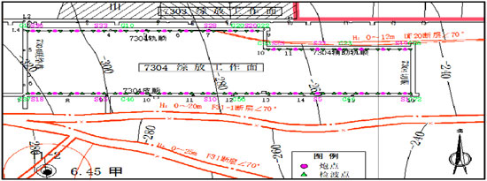 为探查运河煤矿7304工作面地质构造发育情况,为工作面安全高效回采等生产活动提供地质保障,根据《煤矿安全规程》规定,结合井下工作面采掘工程揭露资料,确定了7304工作面槽波勘探的地质任务如下:探测工作面内的隐伏地质构造及煤厚变化情况,圈定煤层变薄区范围并进行综合分析。