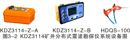 本次7304工作面槽波勘探设备为福州华虹制造的“KDZ3114矿井分布式震波勘探仪系统”,该系统是新一代高效便携的专业型全方位矿井地震勘探系统。系统采用先进的分布式架构,利用自动化采集及高精度同步技术,可在井下灵活组合施工,实现工作面震波CT勘探、巷道超前探测、矿井地震勘探等多种震波观测方法的数据采集。系统由数据记录仪(采集器A),放炮启动记录仪(采集器B),传感器等组成,KDZ3114矿井分布式震波勘探仪系统设备图见图3-2。数据记录仪与放炮启动记录仪间利用高精度时钟同步,在井下同步对时后,所有设备间将以同一时间节拍独立工作。数据记录仪不间断连续采集并存储地震数据,放炮启动记录仪记录雷管起爆时间。在完成所有激发工作后进行数据回收,将所有设备构成总线网络,以放炮记录仪的放炮启动时间为0从数据记录中“裁剪”出各地震道,并形成单炮记录。7304工作面槽波井下勘探设备清单见表3-1。