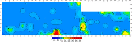 经过槽波专业软件处理,得到数据处理成果,图4-1为山东济宁运河煤矿有限责任公司7304工作面槽波速度分布图,图中暖色(红-黄色)代表高速槽波分布区,图中可见多处条带状高速异常区,高速异常区处反映槽波穿过岩层或应力集中区,构造发育或应力集中。据此7304工作面槽波速度分布图确定3处构造异常,并分别命名为YC1~YC3。