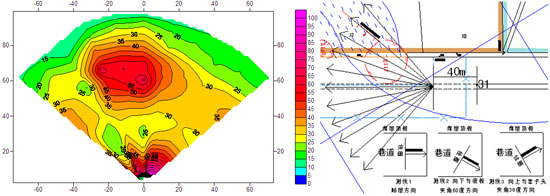 某掘进巷右帮为采空区,跟踪的四次物探探测范围内采空区矿方预计可能有采空积水,经过实际探测完毕以后判断富水性差,后经过矿方打钻等多手段验证采空区内无水。跟踪的四次物探探测范围内有一处不导水陷落柱。