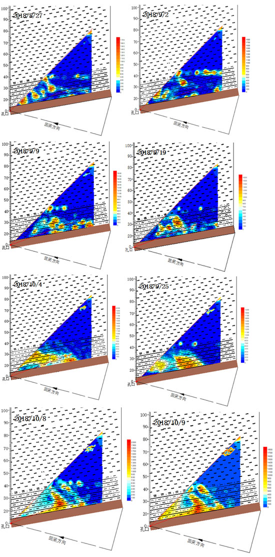 导水裂隙带发育仅为一定高度以下岩层电阻率所发生的变化,每次测试时以岩层背景电阻率分布作为基础,通过动态测试可以从时空规律上直观分析岩层的破坏过程和规律。