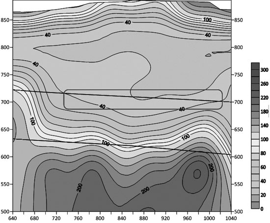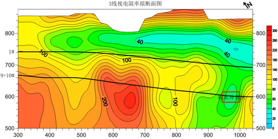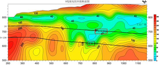 9+10#煤层底板等高线附近视电阻率等值线变化较大,整体视电阻率偏高,在800~860段呈低阻凹陷,结合地质资料推测为积水异常反应。