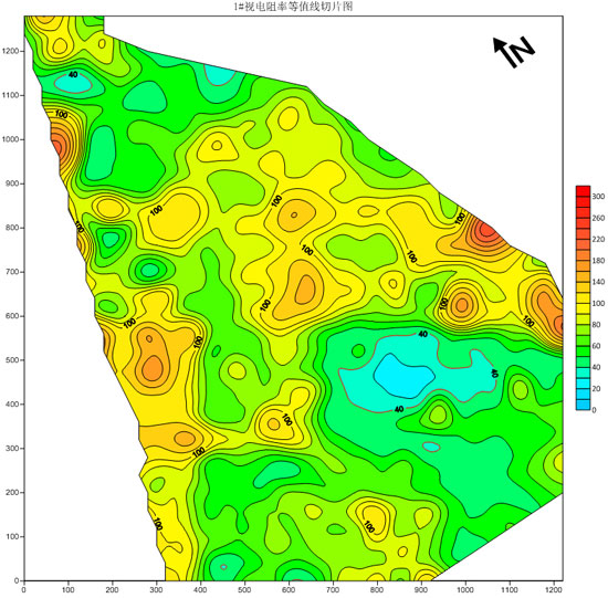 图4-2-3为由矿方提供1#煤层底板等高线深度绘制的顺层视电阻率切片图;本区视电阻率范围一般在20-240Ω·m之间,根据试验,结合已知资料将视电阻率值小于40Ω·m作为积水异常区圈定标准;测区内视电阻率趋势变化比较明显,中东部及西北部相对视电阻率较低。中东部的低阻区范围较大,对比采掘资料分析,该区域为以前的小窑破坏区;西北部出现范围较小的相对低阻区域,结合现场资料,该区域有高压线经过,对瞬变电磁数据干扰较大。