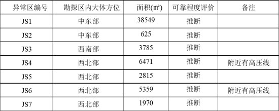 本次勘探共解释1#煤层积水异常区7处,编号分别为JS1~JS7,总面积约59574㎡。