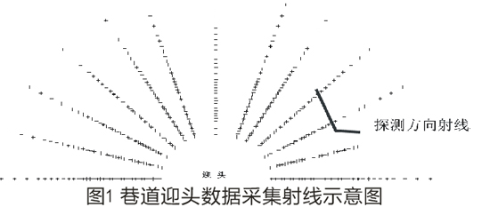 为保证三维效果,数据密度要达到一定要求。特别是远端数据,由于纵向间距增加,因此要通过加强角密度来弥补。如图1所示,在巷道迎头探测周围煤岩层富水性时,远端数据间距越来越大,通过控制角密度弥补探测方向精度。