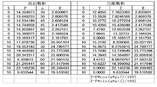 现场数据采集主要记录每个时窗的采集时间、电压、电流等值,通过数据预处理、时深转换、深度校正处理之后,每个数据包含的信息变为点号、距离、视电阻率,是一个标准的二位数据。构建三维效果图首先要构建三维数据库,根据瞬变电磁法反演的数据可以将点号视为X轴坐标,将距离视为P轴坐标,视电阻率视为R值。因为采集数据时,人为的改动探测方向,所以可增加一列角度坐标a,这样P轴和角度坐标形成了一组极坐标。日常应用中更多使用的是直角坐标系,我们只需将极坐标转化为直角坐标即可[1]。转化公式如(1)式: