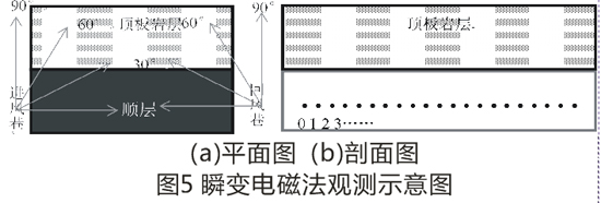 在43121巷开口-4312工作面切眼段和43123巷开口处—4312工作面切眼段各设计矿井瞬变电磁法探测测线4条(顶板90°、顶板60°、顶板30°、顺层),每条测线长1710m,即0~1710m;两条巷道8条测线共计13680m,每条测线,点间距10m。测点由切眼向巷口布置,编号依次为0、1、2…,见观测示意图5。