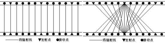 无线电波透视勘探施工方法主要包括同步法和定点法两种。同步法即发射端和接收端分别位于同一个回采工作面的不同巷道中,且等时等距离移动,逐点发射与接收,该方法因为存在未覆盖区域,产生一定盲区,而较少采用,同步法施工示意图见图2。定点法也称定点交汇法,为常用的施工方法,同样发射端和接收端分别位于同一个回采工作面的不同巷道中,发射端一段时间内相对固定在一条巷道的一个位置,在这段时间里接收端在另一条巷道逐点接收,发射接收完成一条巷道后进行互换,并重复发射接收工作,达到完全透视观测,一般发射点间距50m,且发射点位于与一站对应接收点中点相对的另一条巷道位置,接收点一般间距为10m,且接收点数量大部分为11-21间的奇数,定点法施工示意图见图3。