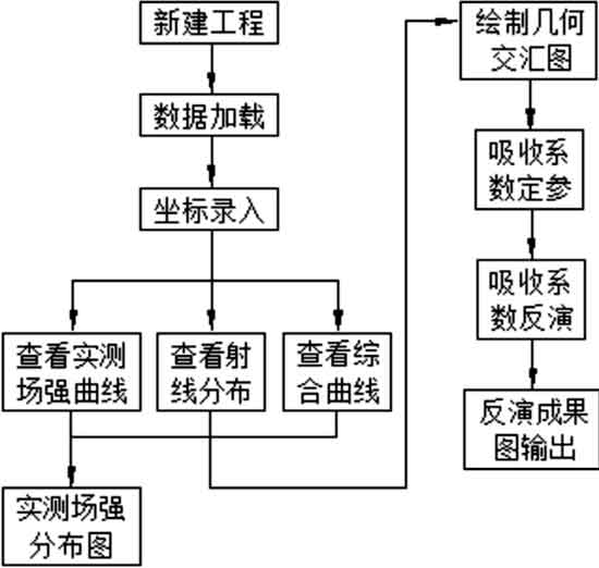 无线电波透勘探数据解释方法主要有场强对比法与成析层像法两种,数据处理主体流程见图4,通过数据处理一般得到射线分布图、综合曲线图、异常交汇平面图、实测场强曲线图、实测场强分布图、吸收系数成像图等。