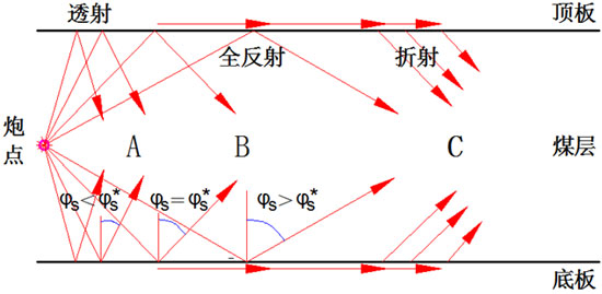 在含煤地层中,煤层是一个相对低速的地震槽。煤层与围岩间的界面,一般呈现良好的反射面,煤层与其顶底板围岩相比总是以低速度、低密度,从而以低波阻抗出现。在煤层中激发地震波,所激发的纵波、横波均以震源为中心,以球面体波形式向四周传播,并以不同的角度入射到顶底板界面,如图2-1。当入射角小于临界角时,大部分能量将透射到围岩之中,只有少部分能量能量反射回到煤层中,返回到煤层的能量,在煤层来回多次反射、透射而迅速衰减(漏失模式);当入射角大于等于临界角时,则入射到顶、底板界面的的地震波能量将全反射回到煤层,并在煤层中多次反射,最后禁锢在煤层之中(正常模式)。地震波在煤层这个低速槽内向外扩散传播,其中上行、下行波在煤层中相互干涉、迭加,多数谐波成分相互抵消、削弱,而逐渐消失;只满足一定条件的各种谐波,在槽内相长干涉而形成垂直于煤层面的驻波,在煤层内不断向前传播,这就形成了槽波(channel waves),也称煤层波(seam waves)。