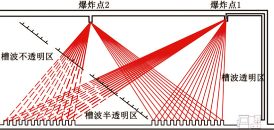 槽波透射法所用的有效波是从震源透过煤层传至接收点的直达槽波信号。如图2-2所示,炮点与检波点(接收点)布置在采区周围不同巷道内。根据槽波的有无、强弱来判断在相应的透射射线扇形区内有无构造异常。