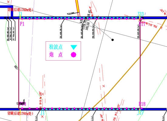 图3-1 1802工作面槽波勘探工程炮孔与检波点布置示意图
