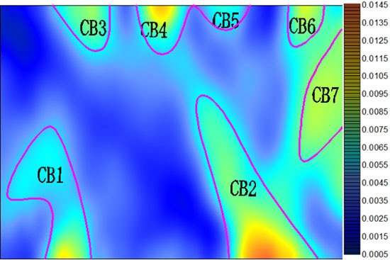 现场资料上传上位机处理软件后,通过数据编辑、坐标设置、坏道剔除、初至校正、带通滤波、能量补偿、能量反演等处理步骤,生成了本次1802工作面槽波地震勘探的槽波能量衰减系数反演成像图,其中,暖色代表槽波衰减系数大,蓝绿色代表衰减系数小,本次槽波勘探共圈定7处衰减系数高值异常区,异常编号标识为:CB1~CB7,具体如图5-1。