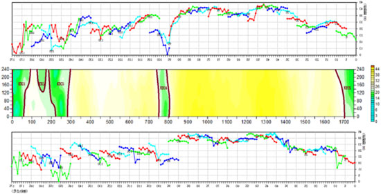 图5-2 1802工作面无线电波透视勘实测场强曲线及分布成像图