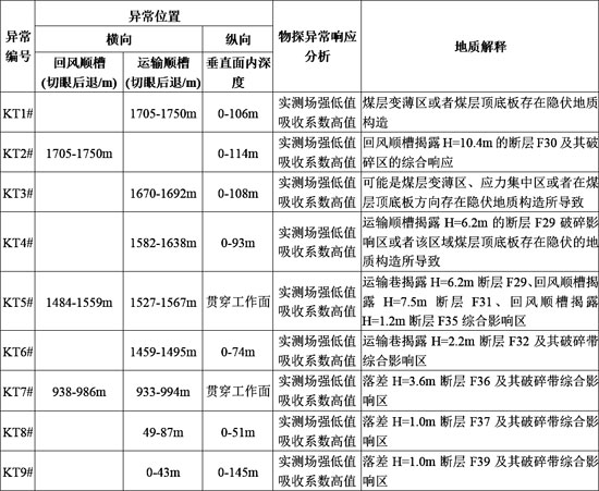 根据实测场强曲线值变化特征、岩石吸收系数、实测场强分布成像图、地质资料和现场情况综合分析,通过异常对比分析最终得到本次探测区域内存在9处异常区,编号为KT1#~KT9#,1802工作面无线电波透视探测成果解释图见图6-2。所有成果图件及表格中,横向距离均以切眼后退距离为准,纵向距离均以垂直运输巷向面内为准。异常区具体范围以及解释如表6-1所示。