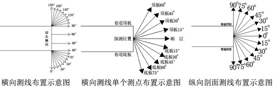 瞬变电磁法施工按照扇形观测系统布置,以巷道迎头为中心点呈扇形布置15个探测点(迎头掘进方向布置3个探测点),最左、最右探测点与巷帮垂直,每个探测点夹角15°;每个探测点剖面上观测10个方向,其中:顶板60°、45°、30°、15°及顺层、底板15°、30°、45°、60°、75°方向;同时,位于迎头巷中沿巷道掘进方向做纵向竖直剖面,自巷道顶板90°至底板90°方向,每个测点夹角15°;本次瞬变电磁探测巷道采集15×10+13=163个瞬变电磁物理点。详见图3-1。